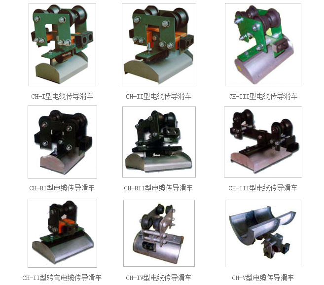 HC系列电缆滑车分为中载荷型、重载荷型、和轻载荷型,因此滑车走轮为Ф80、Ф63、Ф50的三种,承载能力≤50∽150kg,每类按托板层数分为单层、双层、三层,每类中有三种形式,首端为电缆牵引车,终端为固定挂线架,中间为电缆滑车(见下图)。