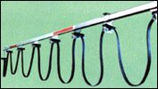 该产品的工作原理见工程应用图示(1)扁平电缆的始端(接现场接线盒)固定于导轧的始端固定器上,再根据现场允许运行的空间,间隔适当的长度(1-2.5mm)依次固定在携带电缆的四轮台车上,电缆未端(接用电源)因定在最后一个小车(牵引车)上。通过拔车上的弹簧拔小车往复移动,通过电缆的拖拽(长度如超过20m应考虑原用牵引绳,使电缆免受拉力)作用,带动所有的小车在轧道中任意速度自由滑动,导轨安装简便,无需调试,且无触点接触供电等优点,安全可靠。